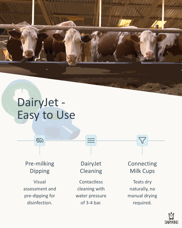 El DairyJet es una herramienta inteligente y asequible que permite una limpieza rápida y eficaz de los pezones por solo 1 euro por vaca al mes. Esta innovación, desarrollada por un colega ganadero, ayuda directamente a reducir la mastitis. Como resultado, las vacas se mantienen más sanas, mejora la calidad de la leche y disminuye el desperdicio.